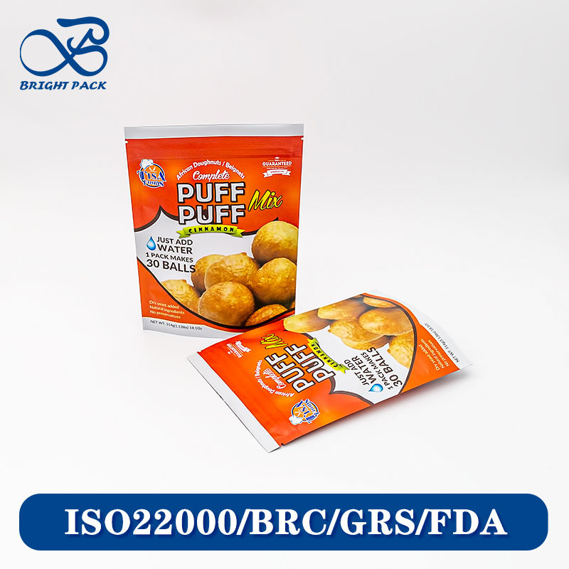 Bolsas stand-up laminadas de diseño personalizado de alta calidad al por mayor para el envasado de snacks. Fabricadas con materiales laminados de grado alimenticio, incluyendo una capa interior de papel de aluminio, estas bolsas crean una barrera robusta contra la humedad, el agua y los contaminantes externos, preservando la frescura, el crujido y el sabor de varios snacks durante el almacenamiento, el transporte y la exhibición en tiendas.